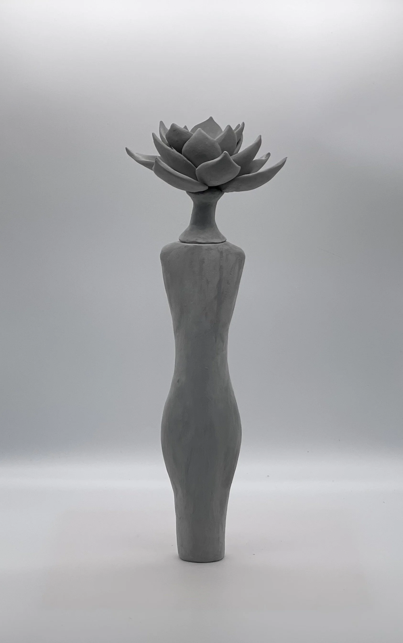 I took inspiration from the hard-working Asian American women I grew up around. I was especially enamored with the amount of strength people like my mother and maternal grandmother have had. The piece features a female bodice, formed strictly to the Asian ‘ideal body’ a byproduct of the sexism ingrained in Asian society. The culturally imposed standardization is reflected in some of the stereotypes and fetishizations that emerge surrounding Asian women. The lotus (an element from my Chinese heritage) symbolizes self-regeneration and enlightenment, and despite the muddy waters lotus flowers root themselves in, a beautiful flower emerges. But, not to forget that below the surface, the lotus roots are tangled and messy. Under the smooth surface lies an internal battle between traditional roles and dreams to reach the surface and show its true beauty—the piece functions as a bottle to hold and conceal the roots of the lotus.