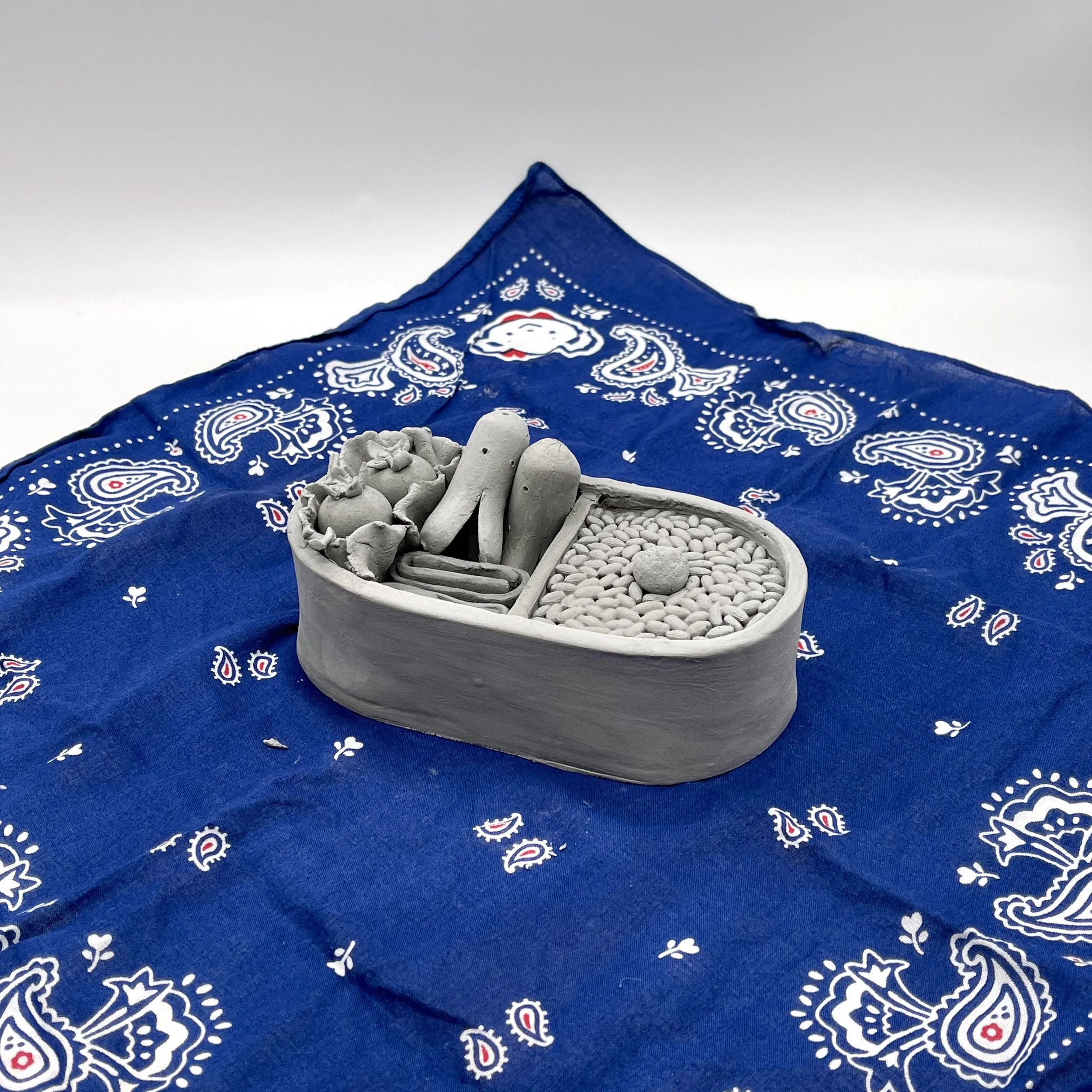 I sculpted a relatively simple bento consisting of rice, egg, sausage, and a small salad. Since this piece is a note to my younger self, I included my favorite handkerchief at the time, an item I still treasure. The relationship linking food and identity is complicated. For much of my childhood, I was made home lunches to bring to school. And up until the first grade, my mother handed me a small bento for lunch every morning. Looking back, I should have been more appreciative when receiving a little lunch made just for me. However, I was upset. Race and ethnicity weren’t even on my radar at six years old, so I learned through my predominantly anglo school peers. One way I learned was through my relationship with bentos. I was told many things about my loved-filled meals at lunchtime, primarily that classmates said it “smelled gross” or “looked gross,” followed by gags and giggles. Embarrassment led to begging my mother to make me “a brown paper bag lunch.” I was in turmoil over my cultural food, something I was taught to cherish and take pride in. The change of my lunches was a way for me to prevent myself from being labeled as different or “not American,” yet there would be enough subsequent instances to prove a change in lunch wasn’t the solution. Food was the one of the first occurrences of my identity being challenged.